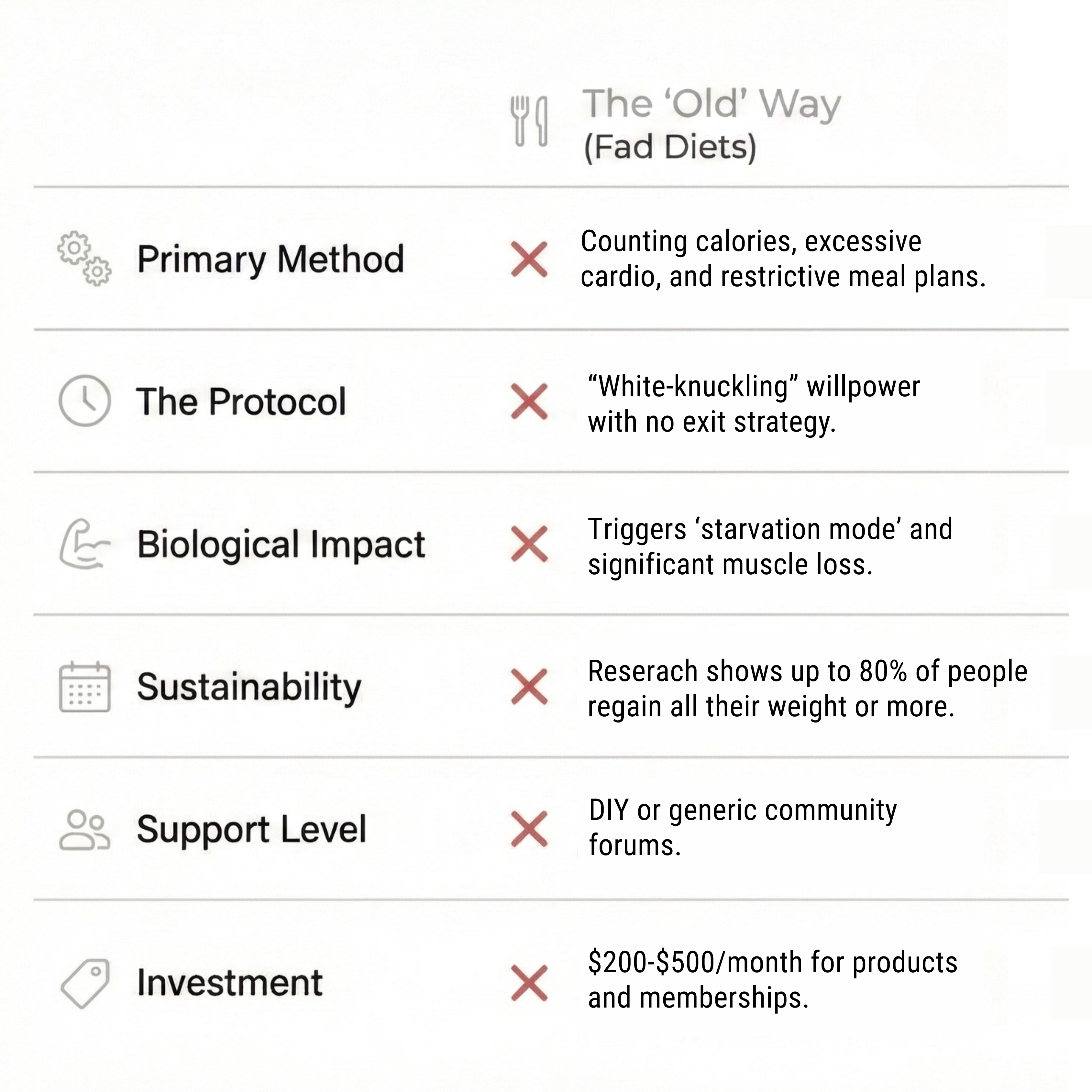 * Clinical Data on Weight Maintenance: Long-term studies, including meta-analyses from UCLA (Mann et al.) and the National Institutes of Health (NIH), consistently show that 80% to 95% of individuals who lose weight through conventional dieting regain it within two to five years. This is largely attributed to metabolic adaptation and hormonal shifts that increase hunger and decrease satiety. In contrast, the National Weight Control Registry tracks over 10,000 “successful maintainers” who have kept off an average of 66–70 lbs for over five years by focusing on permanent physiological shifts rather than short-term restriction.