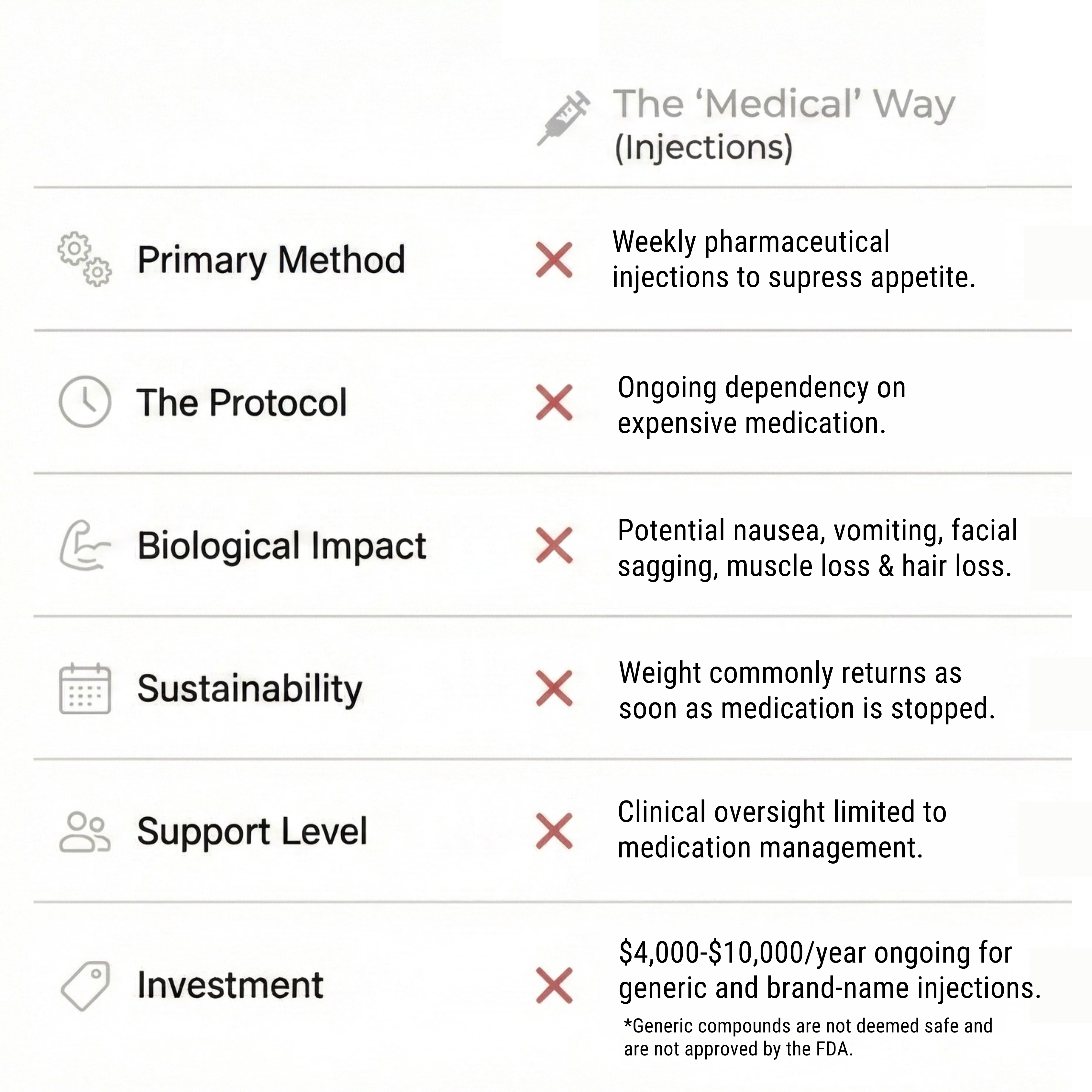 Injections are a chemical band-aid; Everalis is a biological renovation. Instead of a lifelong dependency on a drug, our 16-week protocol addresses the issues in your metabolic pathways to target fat while strictly protecting lean muscle— an essential factor for healthy aging. We don’t just suppress your appetite; we fix your metabolic baseline so you can graduate to long lasting stability without needles or ongoing prescriptions.